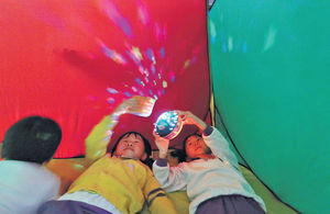 這天周五自由遊戲日,全校室內和戶外被規劃成近10個活動區,每時段會有90位小朋友出入,事前老師會邀請一位孩子當小主持負責介紹遊戲玩法,以及由一位小記者負責拍照及記錄。現場遊戲都富趣味性,像主題遊戲區配合高班在學習的交通主題;科學區佔整個課室,設計了關於光與影的遊戲,讓孩子親自體驗和探索答案;積木區則供他們扮演建築師搭建城市……
